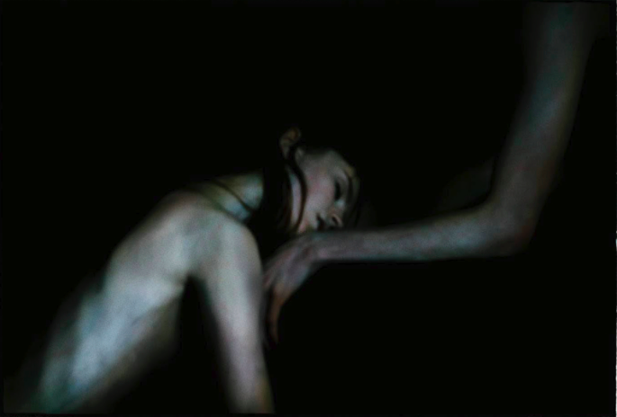 In one of the most striking, a girl bends forward, her back arched, arms and legs reaching towards the floor but cut off by the bottom edge of the picture. Her long hair catches a glimmer of light that lends it a reddish gleam. There is something architectonic in this image, with the arms and legs supporting the body like pillars holding up a central chamber. There’s also a purely animal aspect, reminiscent of William Blake’s picture of Nebuchadnezzar in the wilderness.