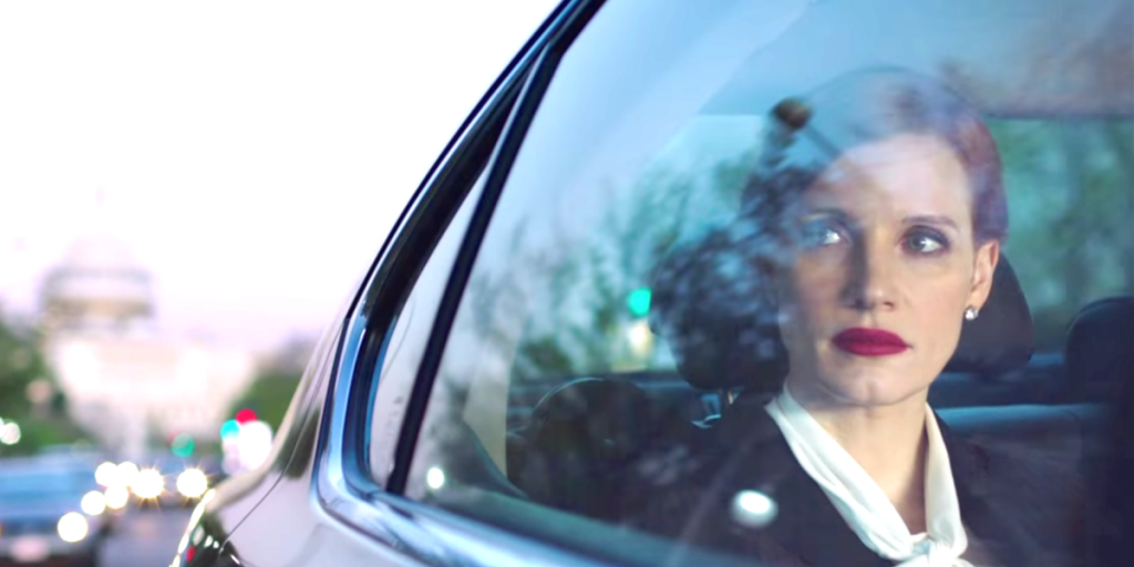 Chastain’s character, Elizabeth Sloane, is well qualified to tell us about the profession. She is a legendary lobbyist for the firm, Cole, Kravitz & Waterman, who never seems to lose. She dresses in sharp, expensive corporate uniforms, and keeps her copper-coloured hair neatly trimmed. She’s attractive but scary – hard as steel and seemingly free from the softer emotions that trouble the rest of humanity. A formidable intellect, a supreme strategist, all she cares about is winning.