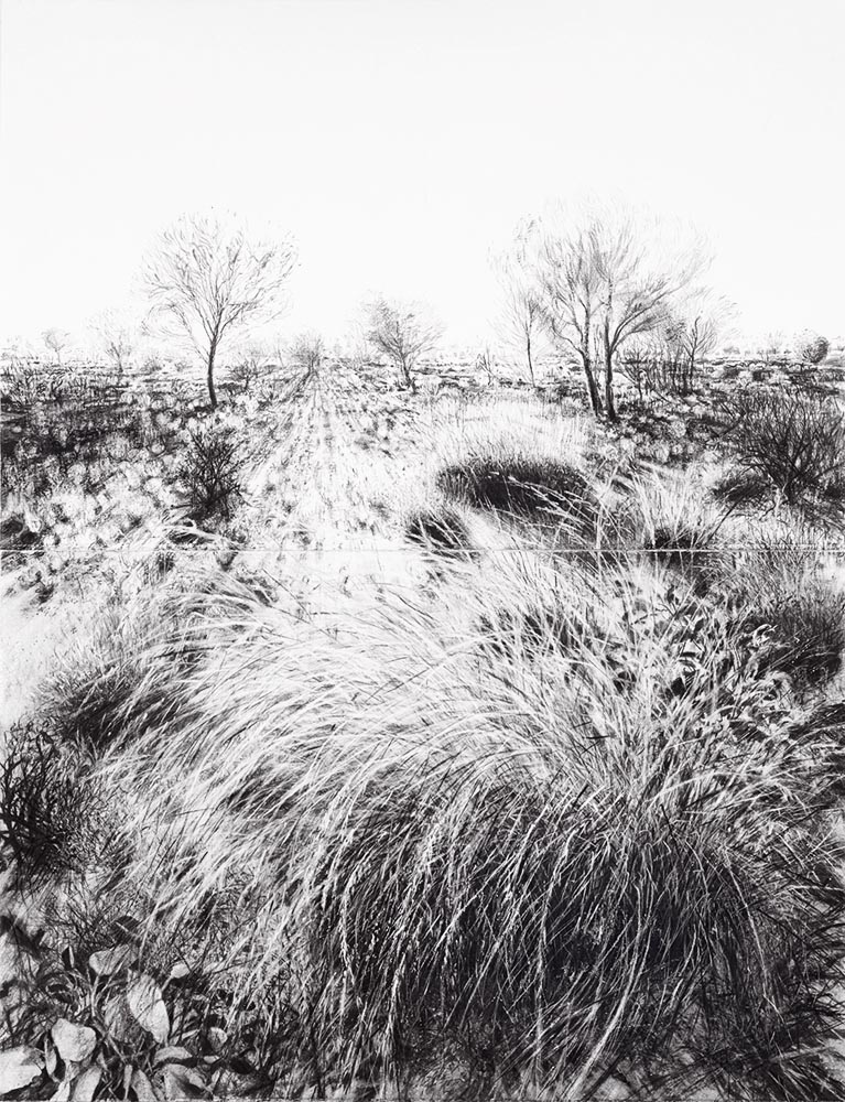Wendy took this requirement seriously, going out into the landscape for weeks at a time, often being completely alone in the desert. The large, detailed drawings of the Great Sandy Desert that became the monumental work, Elsewhere, are deeply meditative in nature. We can feel how profoundly she has absorbed the truth of this landscape before picking up a stick of charcoal.