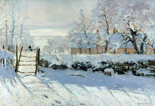 For the Impressionists painting in the snow was not only a test of endurance, it was a challenging exercise in capturing bright, reflected light, and shadows that were more blue than black. The greatest of these landscapes, and arguably the major picture in this selection, is Monet’s The Magpie (1868-69). A black bird perched on a gate gives the work its title, but the real subject is a rural landscape covered in a blanket of dazzling white, raked by pale blue-grey shadows. It’s a painting that doesn’t allow the eye to rest. Looking from one patch of snow to the next, then to whiteness of the sky, is like watching a series of light bulbs flicking on in quick succession.