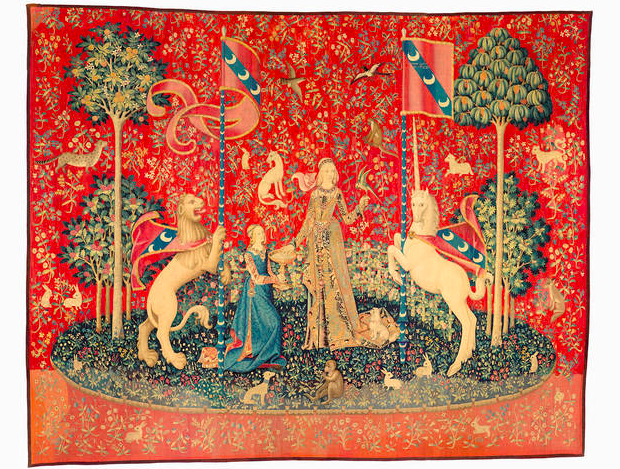 The symbolism of the tapestries has proved even more elusive than the provenance, but in her catalogue essay Elisabeth Delahaye of the Musée de Cluny supports the now-standard association of five tapestries with the five senses: touch, taste, hearing, smell and sight, while the sixth, which bears the legend, Mon Seul Désir, (“My only desire”) is viewed as a sixth sense. It suggests the heart achieves an inner wisdom in transcending the temptations of the sensory world.