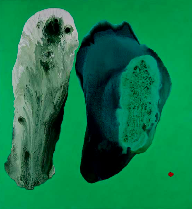By contrast the works on show at Manly, most of them created within the past decade, are saturated in strong colour. In Green Painting (2015-18) two protoplasmic forms float on a canvas of vivid emerald, offset by a small touch of red. Lyric Poem (2016-18) presents such an overpowering field of red that one automatically reads the dark patch in the centre as black when it’s really a kind of greeny-blue. It’s in collision with a caramel-coloured disc that descends from the top of the picture like a comet.