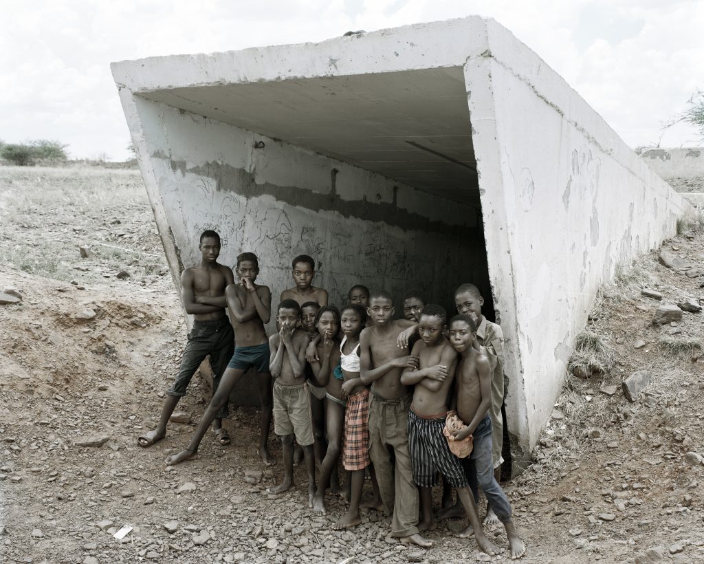 David Goldblatt, 'Children of Pomfret at the entrance to the incline shaft and underground pool of water in which they swim, Pomfret Blue Asbestos Mine, which closed in 1986, North-West Province. 20 December 2002'