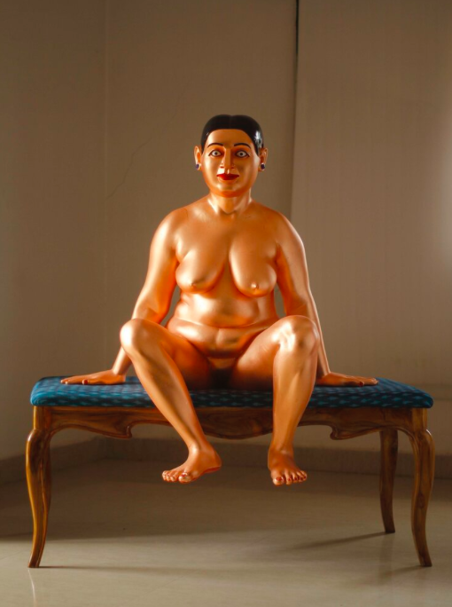 Perhaps the most engaging display was at Vahedra’s other outlet, namely vibrant new life-sized sculptures by Ravinder Reddy, along with a selection of earlier works. Reddy was probably the best represented artist at the fair, with sculptures in four separate booths. He has gradually become an iconic figure in Indian art, known for taking the sensuous forms of temple sculpture and giving them a contemporary makeover.