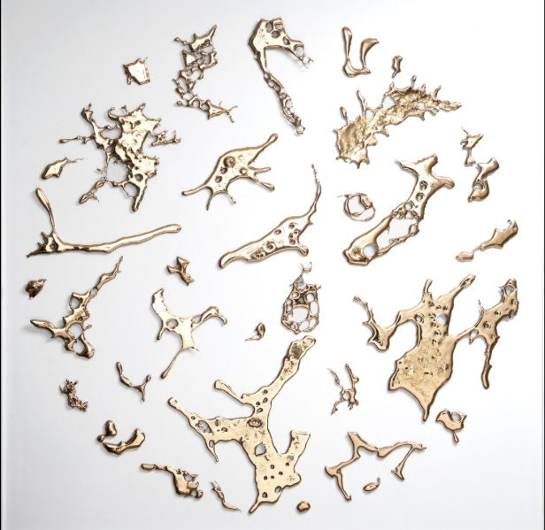 When it comes to flinging molten metal, everything depends on where she places her hands on the implement and the power of the throw. Each frozen splatter retains its liquid appearance. She imposes order on these shapes by arranging them in a geometric form on the wall.