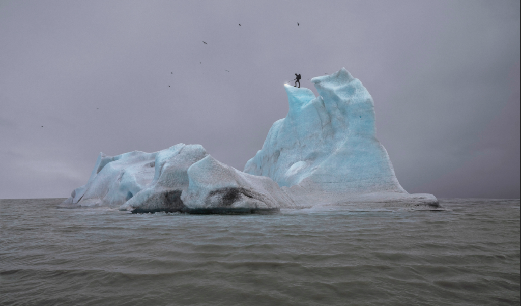 Julian Charrière’s The Blue Fossil Entropic (2013) records a performance in which the artist tried to melt an iceberg using a blowtorch – only to see the water freeze again almost immediately. Charrière’s tiny figure propped on top of an iceberg reads as a symbol of futility, a measure of our own insignificance in the face of Nature.
