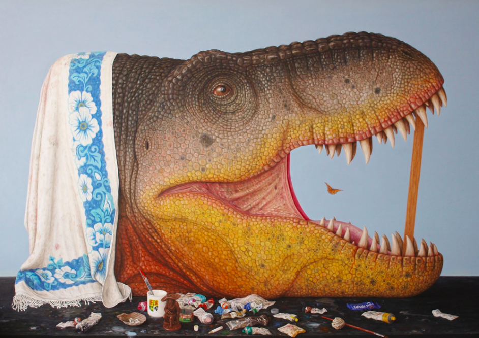 There are numerous images of prehistoric fish and flying creatures made in the manner of natural history illustrations, although without a methodical scientific approach. The representative image for the exhibition (it won him the Sulman Prize in 2014 and has been made into a jigsaw puzzle!) is the head of a Tyrannosaurus Rex displayed on a table, its jaws propped open with a stick. The back of the head has been draped in a blue-and-white tablecloth. On the table in front of the T-Rex are a lot of half-squeezed paint tubes and other bric-à-brac. Look closely at the monster’s eye and you’ll see a tiny reflection of the artist – a cute way of adding a signature that is repeated in other works.