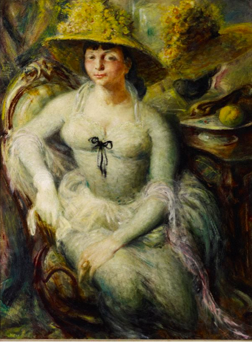 While she appears in the guise of a grand dame we know Olley was really a Bohemian in fancy dress. Dobell had his tongue in his cheek when he conceived this portrait, but his affection for the sitter is undeniable. As for Olley, rarely did she ever seem so aloof, as if her chair was her throne. She has the bearing of one of Gainsborough’s great ladies but it’s all a modernist masquerade. The dress was made from ex-war supply parachute silk, with sleeves taken from an antique wedding dress supplied by a friend’s mother. The hat was an old one hastily decorated with flowers. Dobell had seen Olley in the “Duchess” dress at a party, but when she sat for him she was wearing her normal clothes. The finished portrait, which she declared “magnificent”, came as a big surprise.