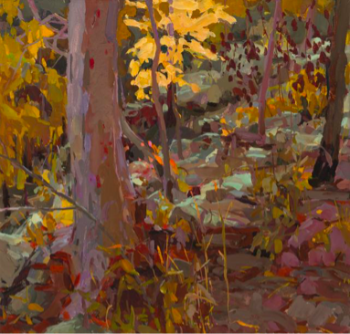 Mary Tonkin is a purposeful painter who captures the small, flickering effects of sunlight as they filter through the leaves of the forest. Unlike Collins, who is remarkably open to each new sensation, Tonkin carries her palette in her head. She paints in autumnal colours – chiefly gold, ochre, lavender, grey-green and touches of red. In works such as Dawn citriodara, Mt. Zero Taravale, she brings us into the heart of the forest, surrounded by dense undergrowth. Sight lines are broken by twigs and grasses that cut across the tree trunks that soar upwards, out of the picture, towards a canopy we can only imagine. Firecrackers is a mass of thin, coloured streamers of grass that bunch and divide in all directions.