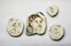 There have been many occasions when portrait prizes have been spoiled by odd, gimmicky pieces clamouring for attention, but this show mght have benefited from a few more unorthodox entries. The most innovative contribution is probably Sassy Park’s Ebony and gels, a portrait of ceramic artist, Ebony Russell, surrounded by cherubs, painted on four small porcelain discs. The wall fragments of Pompeii supplied the inspiration for a modest but ingenious work, that pays homage to the artist and the sitter’s medium of choice.