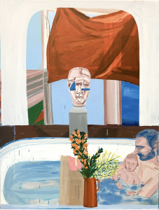 Sally Anderson’s Guido holding folding moulding is another stand-out. Ostensibly a portrait of her artist husband holding their child, there’s a metaphysical dimension to the work, with a sculpture on a pedastle, a jug with flowers and a red, flag-like curtain taking up significant space in the composition. The play of curves and fractured planes adds to the mystery of the picture, as we feel we are looking through multiple doorways or windows, projecting a dream-like atmosphere.