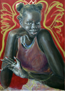 The most flamboyant work in the show is probably Esther Erlich’s Atong, a portrait of the Sudanese-born photographic artist, Atong Atem, herself an exponent of vividly coloured portraiture. Even though this is a half-body study, Erlich has emphasised the sitter’s height by having her long arms enfolded within the rectangle of the picture, as if she can barely squeeze them in. An outline in gold, with the suggestion of wings and a crown, denotes an extroverted personality. With some portraits the distance between artist and sitter is palpable, but in this instance one can feel how warmly Erlich responded to her subject.