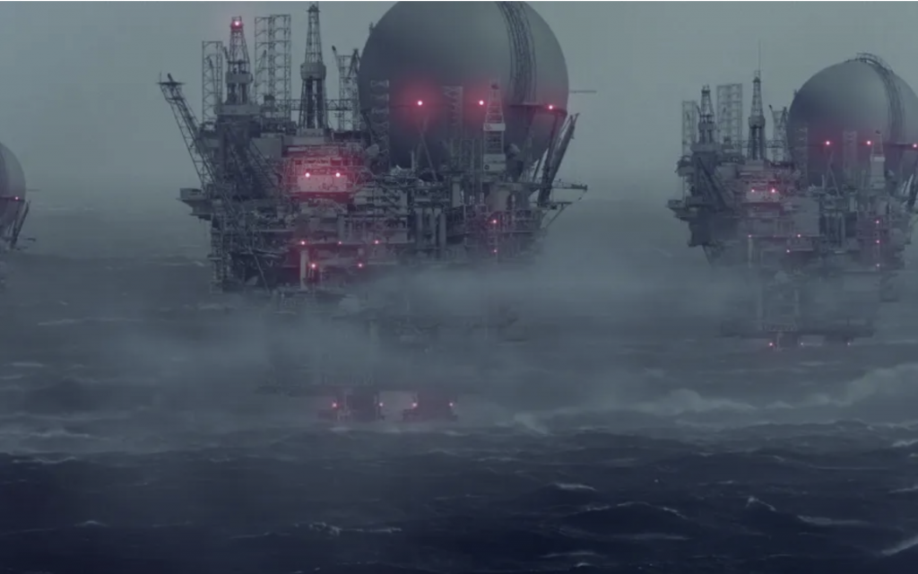 The second film, The Great Endeavour, gives visual expression to the gargantuan effort we would have to make to extract enough carbon from the atmosphere to offset the quantities already accumulated. It’s a vision of gigantic windfarms set in the oceans, of solar panels laid out amid immense swathes of desert, of a worldwide campaign to harness natural energy sources and begin the repair of the planet. It would be “the largest engineering project in human history, equivalent in size to that of the entire fossil fuel industry.”