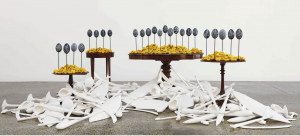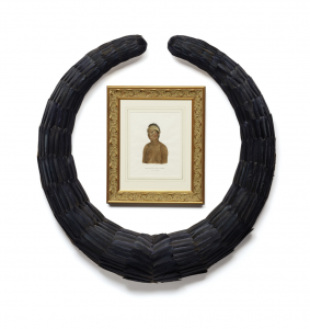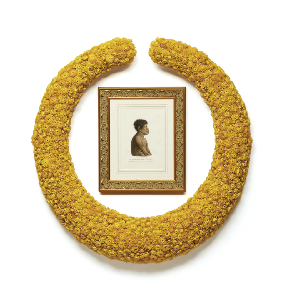 Along with the doilies, presented on long rows of lecterns so recently made one can smell the fresh wood, Jones has included a video by Jazz Money, a soundscape featuring Lille Madden. He has also created a set of complementary installations. Engraved emu eggs and piles of yellow blossoms are clustered on the tops of antique tables, the ghostly plaster casts of traditional Aboriginal weapons heaped on the floor. The most striking work, untitled (remembering Eora), features six large, ornamental wreaths made from emu eggs, seashells, gum nuts, paperdaisies and possum fur. Within each of them is a portrait of one of the early inhabitants of Port Jackson, sketched by Baudin’s artist, Nicolas-Martin Petit, and engraved for publication in France.
