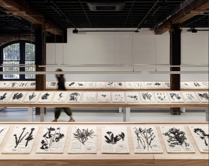 The main part of the exhibition consists of more than 300 embroidered doilies, each featuring a black silhouette of a plant specimen collected by the French explorers who travelled to Australia on Nicolas Baudin’s voyage of 1800-04. Most of the sewing was done by the ACE Embroiderers Collective, a multi-ethnic group of women working out of Parramatta, who came to Australia as migrants or refugees.