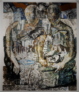 The major De Chirico appropriation in this show is The Vortex (1984), which borrows its basic forms from The Archaeologists (1927). In De Chirico’s painting, two seated, blank-faced figures in togas hold a jumble of classical ruins on their laps. In Tillers’s massive 4 X 3.4 metre composition, the two figures hold images from many different times and places, including Papunya painting. The earlier artist’s fixation on the classical world, like Jonathan Jones’s single-minded focus on First Nations matters, is not sufficient for Tillers. In these years he sought to rove freely across space and time, using Mosman as a launching pad from which to explore the constellations.