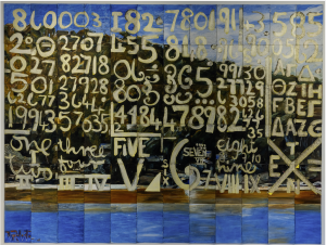 The final work in the show is View (1989), painted just before Tillers left Mosman. A scaled-up copy of Tom Roberts’s The camp, Sirius Cove (1899), hidden behind a storm of numerals borrowed from Colin McCahon’s Numbers (1966), it celebrates the centenary of Roberts’s painting and Tillers’s departure for fresh fields. There’s a feeling of nostalgia in this work, and a sense of empathy with the almost supernatural appeal numbers held for McCahon. It’s as if these hand-drawn figures contained the key to some great secret.