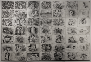 The show includes the artist’s first ever canvasboard piece, Suppressed Imagery (1981): 49 panels, 7X7, featuring idiosyncratic drawings copied from Latvian childrens’ books, works by Giorgio De Chirico, and a blurred postcard of the Basilica of St. Francis in Assisi. It’s already an enigmatic mix that invites us to search for affinities. Each panel is lightly gridded in pencil, to assist the image transfer, and numbered. Seeing canvasboard no. 1 is like viewing some rare museum artefact. There are now more than 100,000 boards in this ongoing sequence.