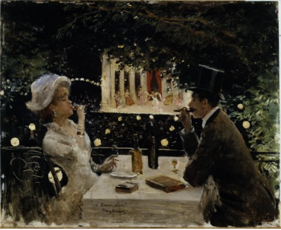 There’s a similar sexual comedy in Dîner aux Ambassadeurs (c. 1880), where an elegantly dressed young woman is knocking back a glass of red wine, while her male friend, with moustache and top hat, points his cigar towards her like a blowpipe. Already there are two empty bottles on the table in front of them.