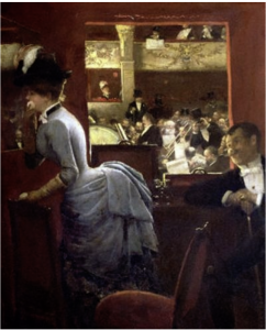 Nevertheless, it’s enjoyable to see a large body of Béraud’s work because he is such a wry observer of the world around him. In The Box by the Stalls (c. 1883), a young woman in a grey dress with an enormous bustle, leans over to adjust her make-up, but her companion can’t take his eyes off the sculptural creation that adorns her rump. Neither can a stranger with a pair of opera glasses, who stands amidst the orchestra, peering into their box.