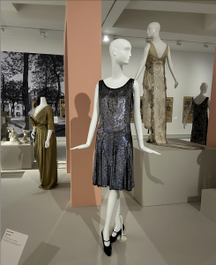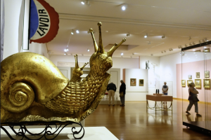 Within each section there is a cluster of paintings, posters, costumes, sculptures, jewellery, objet d’arts, vintage newsreels, and even menus. The eye-catching items in the first room are two large, gilded snails, which once graced the front of a shop in the 1st arrondisement. There are also shoes, hats, advertising posters for department stores, and street decorations used to identify other kinds of merchant.