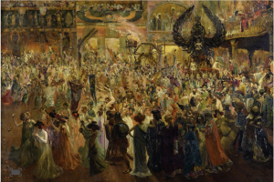 Works tend to be illustrative and topical, which doesn’t preclude the riotous fun of Louis-Abel Truchet’s The Quat-z’Arts cabaret ball (1903), a depiction of a crowded, debauched scene from the annual art students’ ball.